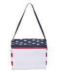OAD 600 Denier Americana Cooler. 600 denier material. Holds 6 cans. 22.5" adjustable navy strap. Insulated with lead-free PEVA lining. Stars and stripes pattern with a large white print area on open front pocket. 8.5 x 6 x 6.
